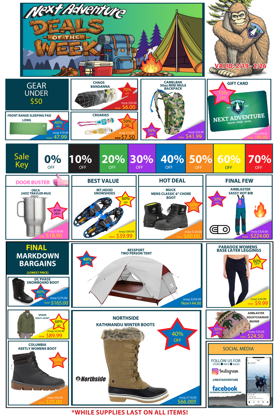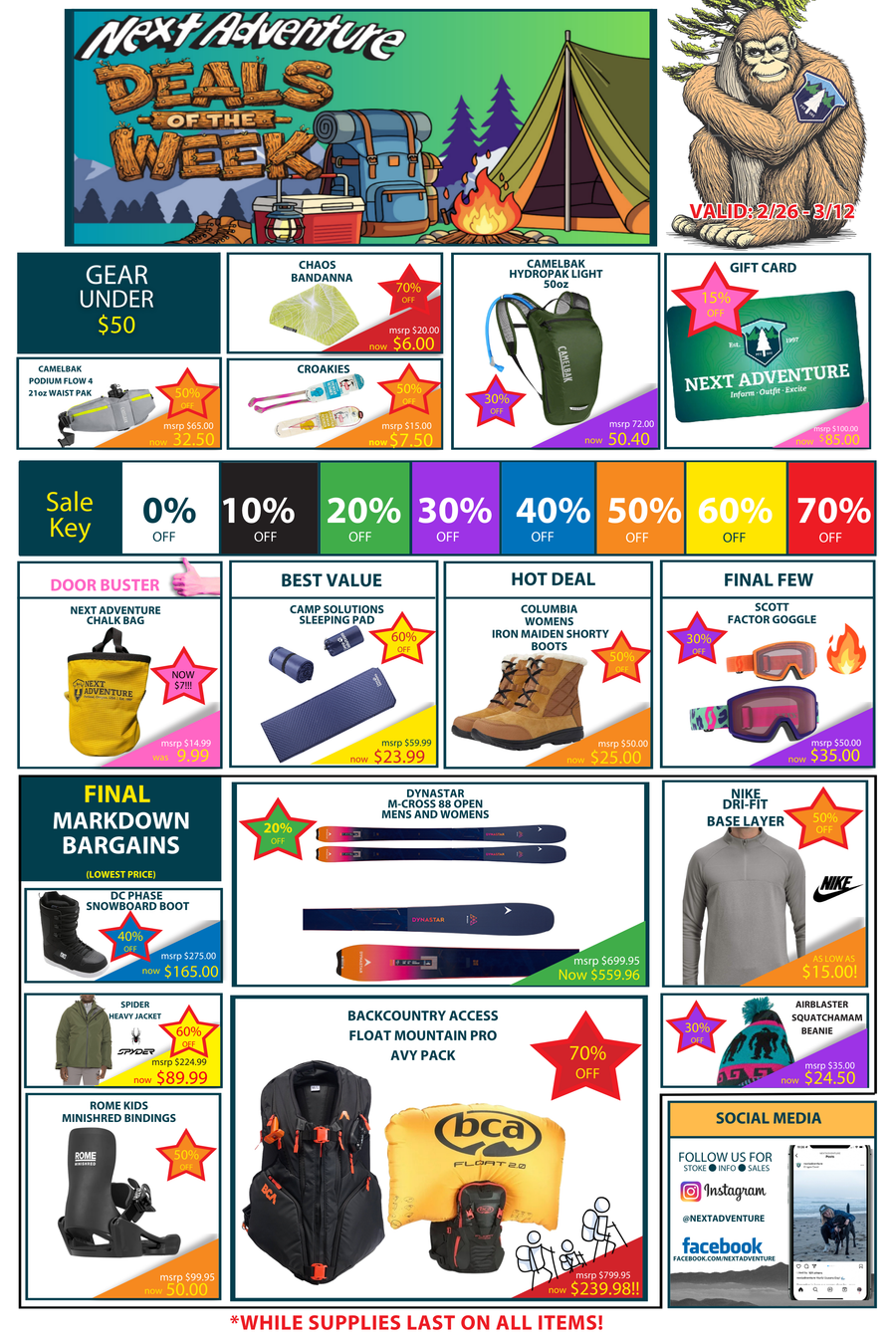 NEXT ADVENTURE LIVES ON!! Visit us in-store for the hottest deals on gear, apparel, and adventure essentials!